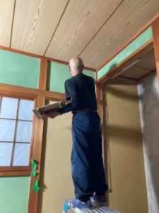 施行工事前の状況です。シミが出てきたり、ひび割れしてきたためリフォームします。 ひび割れした壁を補強し、上から塗っていきます。 完成写真です。落ち着いた抹茶色の壁に仕上がりました。