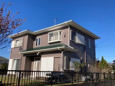 外壁・屋根・雨樋(あまとい)などの外部全体のリフォーム工事を依頼されました。 東側からの様子です。 全体的に色が褪せています。 お客様の希望で、茶色に近いグレーっぽい落ち着いた外壁の色になりました。 屋根は明るめのグリー […]
